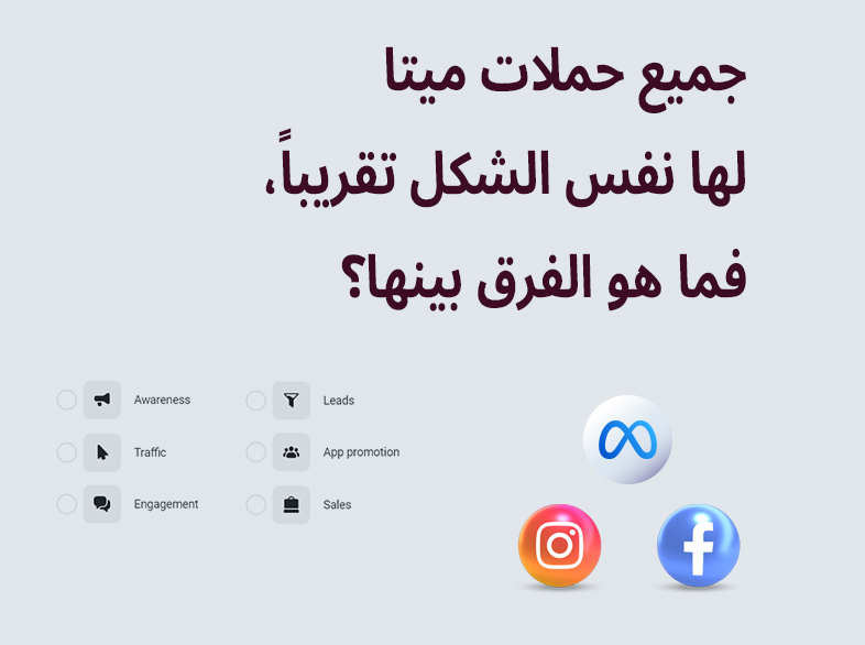 عند إنشاء إعلان على منصة ميتا، ستجد هناك عدة أنواع حملات: ” الوعي، الزيارات، التفاعل، العملاء المحتملون، ترويج تطبيق، المبيعات
